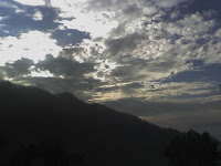 A misty morning awaited me on getting up today. The light cottony clouds had shrouded the upper slopes in a mysteriously surreal canopy and allowed a breathtaking spectacle first thing in the morning. What a blessing! Can one ask for more? My gaze lingered on and on till I became conscious of the yellow orange reflection far away in front, trying to elbow its way out of the dense cloud formations there. The clouds happily obliged. They glided upwards gaily, freeing the towering mountains of its loving grip. At such a moment, standing still with a mind which is raring to encompass all the sensations of the physical world, conscious of the palpable but unnamed sounds, probably of the damp vegetation, waking up in unison and participating in a subdued chorus of its own, blended with mildly shrill cheeping of tiny birds, is a motif available only in the hills. Slowly the day dreaming gets jolted and disintegrates in the wake of human noises. Such deep bonding with the surrounding phenomenon is realized only in the cool stillness of the early morning when the world is slumbering. An experience totally private, generating vibes and waves of unique positive dimensions.