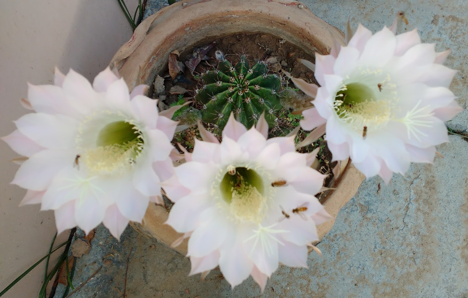 A few days ago i woke up to the enchanting and fresh smiles of this trio. This cactus variety blossoms twice a year but sadly its life is very short. By the evening it wilts. Yet 'A thing of beauty is a joy for ever.' Keats