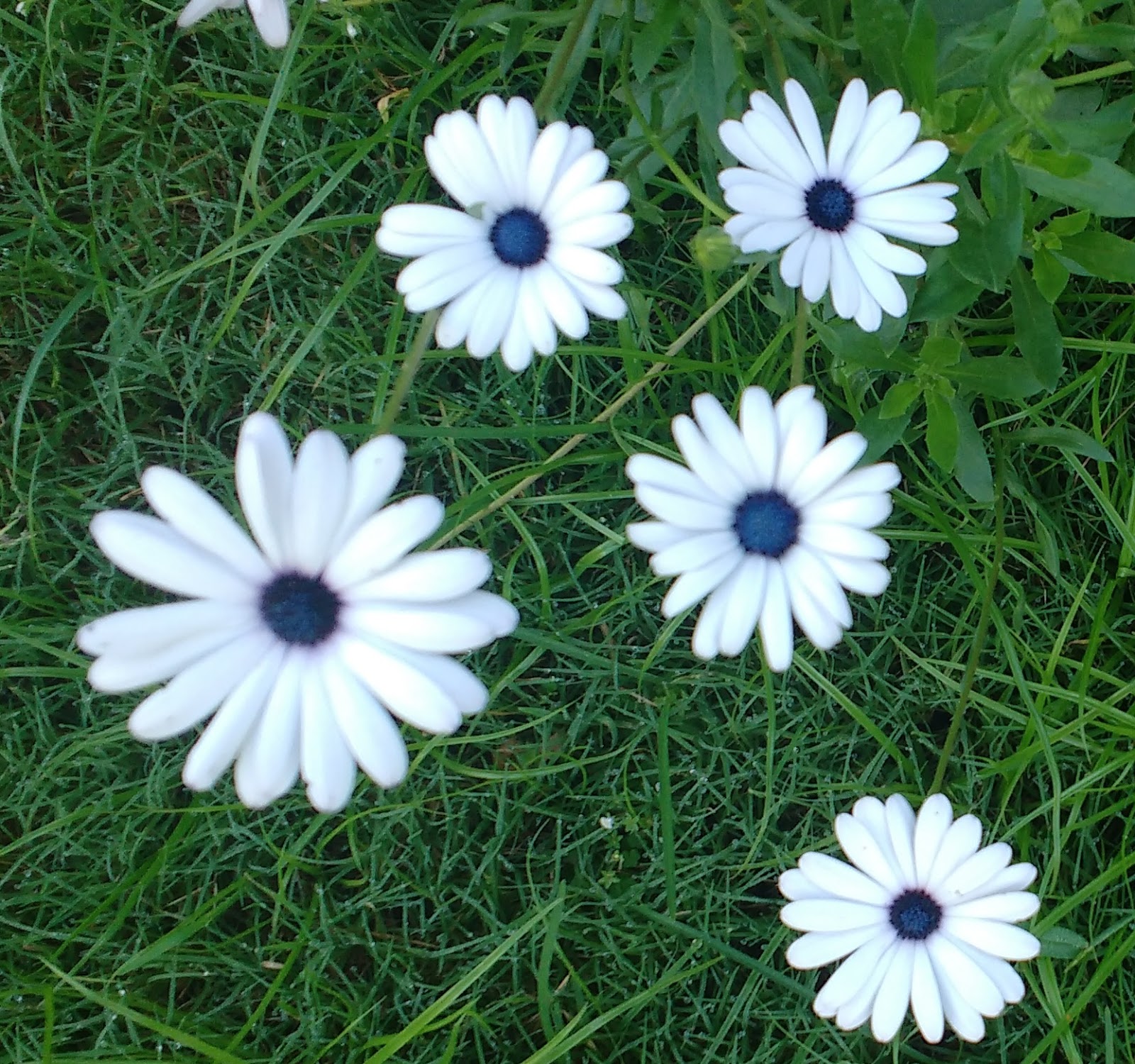 ReplyDeleteThat second photo is amazing. I've never seen flowers like that...white daisies with purple-blue centres. Wow.