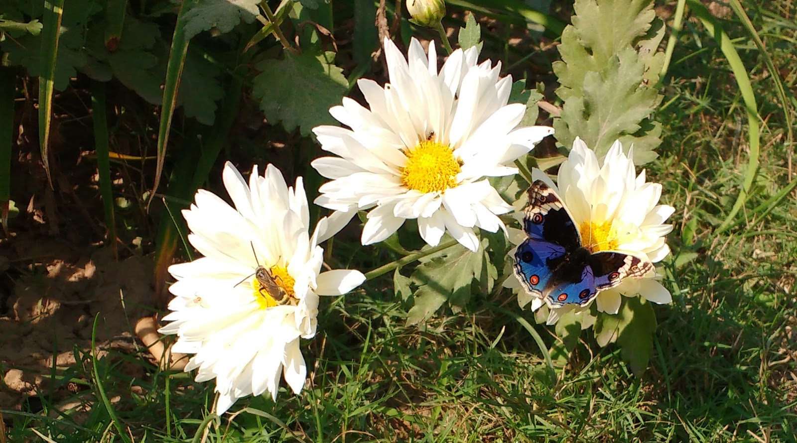 After a lon ...g time I could inspire myself to make an effort to capture a critter: here a butterfly.. It's an effort indeed. I followed her flight and eventually succeeded in capturing the designer beauty in my chrysanthemum patch! The morning sun accentuated the glimmer of her multiple hues!