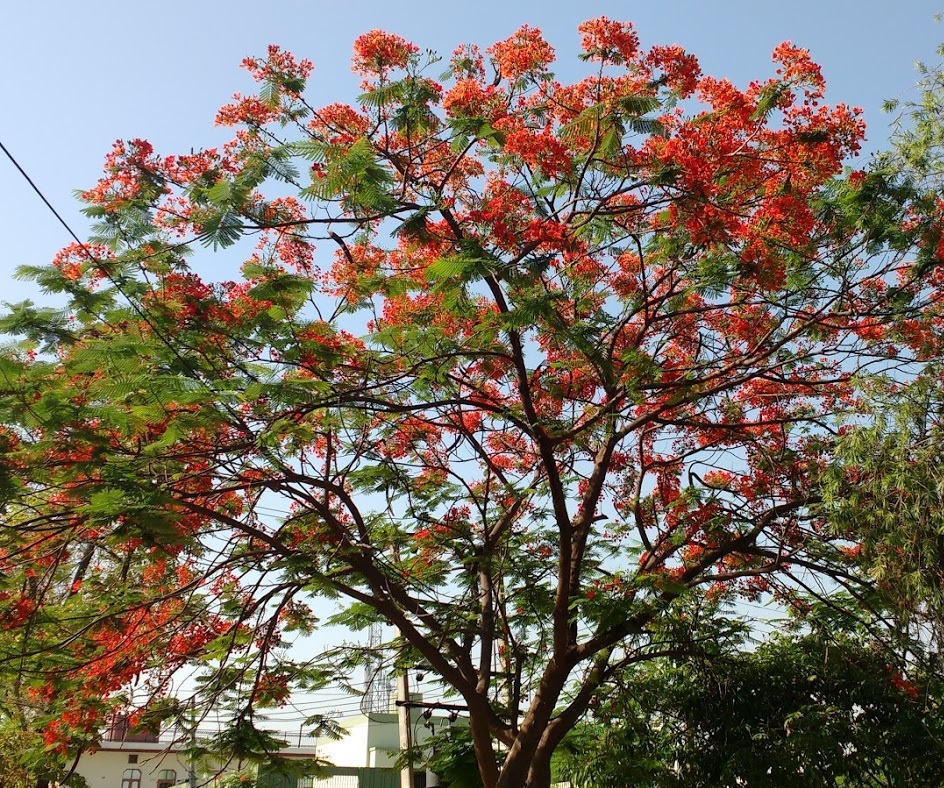 Fortunately, gulmohars in our area are resplendent with orange colored delicate bunches of flamboyant blooms. They provide a visual feast that is noticeable even from a distance. Their flower-laden branches, filter through the spread of other trees to mesmerize the initiated. Wherever you sight a gulmohar these days, you’ll find it in full bloom.